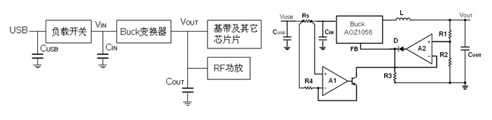圖1b所示電路需要用二個運放,A1用于檢測輸入電流,A2用于隔離電壓和電壓反饋信號,以保證電壓和電壓反饋信號中只有其中的一個信號參與系統(tǒng)的反饋工作。二極管D防止運放A2的輸出管腳出現(xiàn)灌入電流。請注意,在輸出瞬態(tài)過載時,降壓變換器工作于恒流及限流模式,但仍輸出電流。在輸出瞬態(tài)過載期間,降壓變換器仍可以提供一定比例的輸出電流給射頻模塊,因此所需的輸出超級電容值可以減小。若限流值為0.5A,則輸出超級電容值可以減小25%。