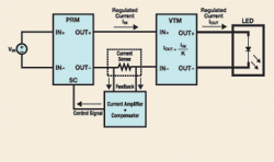 V•I芯片PRM整流器和VTM電壓變換器用來(lái)提供穩(wěn)定的電壓。為了使用PRM和VTM給LED供電,需要修改PRM的工作方式以提供穩(wěn)定的電流。這是通過(guò)采用電流放大器和補(bǔ)償器來(lái)實(shí)現(xiàn)的。
