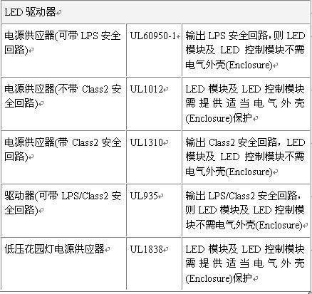 4.其它要求:如LED電源、LED數(shù)組、LED模塊及LED控制模塊等安全及外殼要求等。LED的電源可以是下列標(biāo)準(zhǔn)所驗(yàn)證的電源供應(yīng)器,包括UL1012,UL1310及UL60950-1?;旧?,LED數(shù)組、LED模塊及LED控制模塊只要位于LPS/Class2安全回路上,就沒(méi)有任何電氣外殼的要求。LED燈具對(duì)于電源輸出方式的規(guī)定為基本絕緣,與完全沒(méi)有隔離是一樣的。對(duì)于LED數(shù)組、LED模塊及LED控制模塊,如果使用的電源不用大到超過(guò)LPS/Class2,建議最好要符合LPS/Class2。反之,若使用的能量將大于LPS/Class2,則有沒(méi)有提供隔離一次側(cè)與二次側(cè)電源電路的絕緣,對(duì)塑料外殼的要求上,是沒(méi)有差別的。