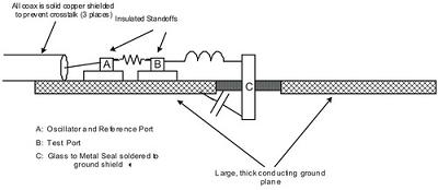 測試電感性能的最有效方法就是將被測試電感放置在最終開關(guān)電源電路上,然后對此電路的效率進行測量。但是,這種測試方法需要有最終電路,不易采用。現(xiàn)在,有一種相對簡單的測試方法,可以在設(shè)計開關(guān)電源前對電感的磁芯損耗進行測試(在其設(shè)定的開關(guān)頻點上)。首先,將磁芯串連放置在低損耗電容介質(zhì)上(比如鍍銀云母)。然后,用一系列共振模驅(qū)動。其中介質(zhì)的電容值需要與被測電感的開關(guān)頻率一致。最后采用網(wǎng)絡(luò)分析儀來完成整個測試過程(信號發(fā)生器加上一個射頻伏特計或者功率計也可以完成測試)。測試設(shè)備的結(jié)構(gòu)如圖2所示