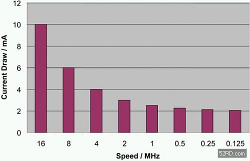 在淺層睡眠模式時(shí)中,時(shí)脈速度從16MHz降低至0.125MHz ,電流從 10mA降低至 2mA (如圖1所示)