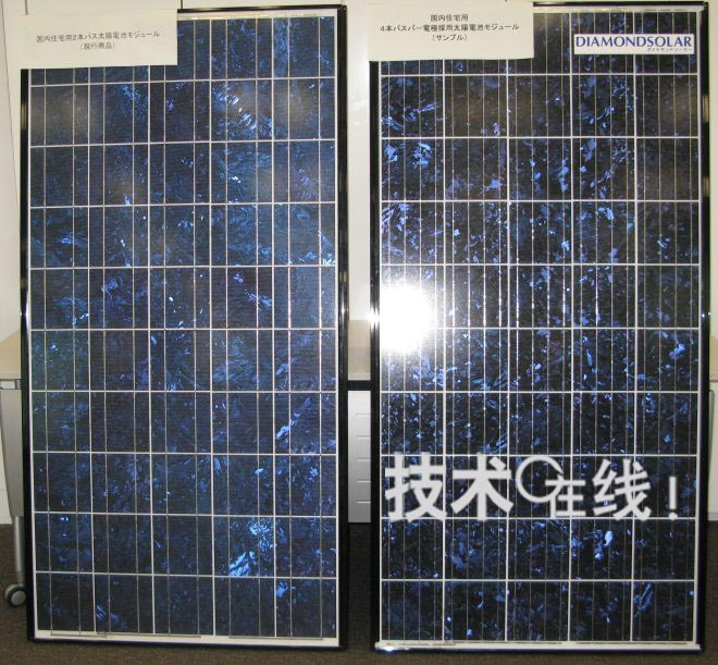 現(xiàn)有的輸出功率185W多晶Si型面板(左)和將于2010年6月投放日本市場(chǎng)的190W多結(jié)晶Si型面板。通過將各單元上作為電極的總線布線從2根增至4根,提高了輸出功率。