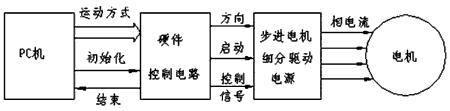 PC機(jī)在適當(dāng)?shù)臅r(shí)刻通過(guò)對(duì)硬件控制電路上的8253計(jì)數(shù)器0賦初值,設(shè)置好加減速過(guò)程的頻率變化(即速度、加速度變化),以防止失步。例如,在點(diǎn)位控制中設(shè)置好速度曲線圖,在起動(dòng)和升速時(shí),使步進(jìn)電機(jī)產(chǎn)生足夠的轉(zhuǎn)矩驅(qū)動(dòng)負(fù)載,跟上規(guī)定的速度和加速度;在減速時(shí),下降特性使負(fù)載不產(chǎn)生過(guò)沖,停止在規(guī)定的位置。硬件控制電路板上的8253產(chǎn)生脈沖方波作為中斷信號(hào)源,啟動(dòng)細(xì)分驅(qū)動(dòng)電路中的固化程序以產(chǎn)生一定頻率的脈沖,經(jīng)功率放大后驅(qū)動(dòng)步進(jìn)電機(jī)運(yùn)動(dòng)。步進(jìn)電機(jī)運(yùn)動(dòng)方向的改變及啟動(dòng)和停止均由計(jì)算機(jī)控制硬件控制電路實(shí)現(xiàn)。