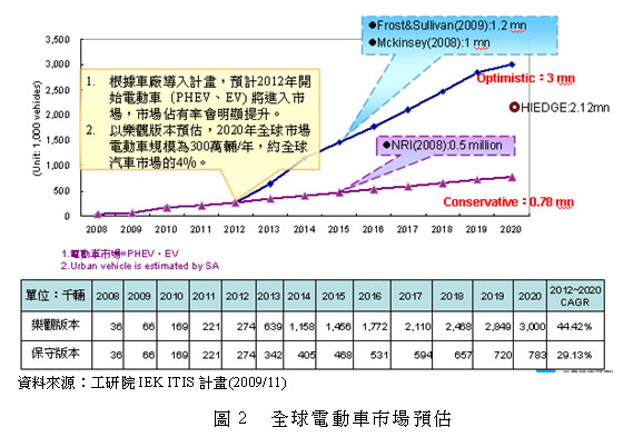 近年來,因應(yīng)氣候變遷及降低石油依賴等考量因素,全球各主要國家積極發(fā)展低污染與低(零)油耗的電動車,促成鋰電池產(chǎn)業(yè)在原有應(yīng)用領(lǐng)域之外的新需求。根據(jù)各國的補(bǔ)助政策及車廠推出的電動車計(jì)畫,預(yù)計(jì)電動車將在2012年開始進(jìn)入小規(guī)模量產(chǎn),同時(shí),以較樂觀的成長率推估,預(yù)期在2020年可達(dá)到年銷售量300萬量的規(guī)模,未來市場預(yù)估如圖2。