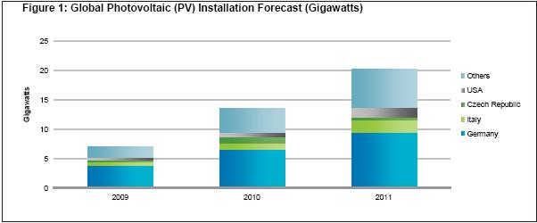 圖1所示為iSuppli公司對2009-2011年全球光伏裝機(jī)容量的預(yù)測。