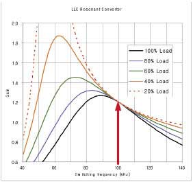 利用PFC級(jí),LLC轉(zhuǎn)換器的輸入可設(shè)置在400V左右。如果所需輸出電壓為12V、匝數(shù)比為40:1,則額定負(fù)載下需要1.2的DC增益。無論負(fù)載情況如何,頻率始終不變。