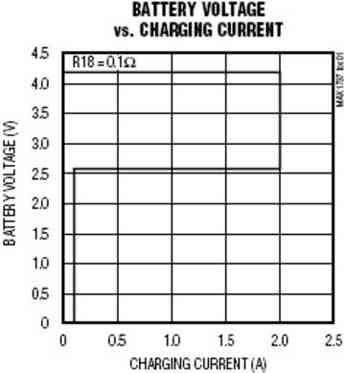 圖1為用于鋰離子電池充電器的CC-CV集成電路(MAX1737)的V-I特性曲線。這種類(lèi)型的IC是消費(fèi)類(lèi)產(chǎn)品中所有鋰離子電池充電器的核心。圖中可清楚看出CC(2.6V至4.2V電池電壓)和CV(4.2V)區(qū)域。