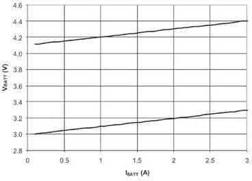 圖4圖2電路在電壓為4.1V(上部曲線)和3V(下部曲線)時(shí)的吸入電流,兩種情況下斜率均代表0.1Ω內(nèi)阻