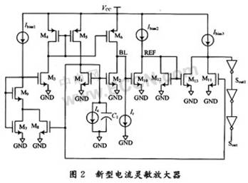 靈敏放大器的工作目的是通過放大位線上微小信號的變化而讀取存儲單元中的數(shù)據(jù)。一般可以分為電流型靈敏放大器和電壓型靈敏放大器兩種。由于電流靈敏放大器直接探測輸入電流的變化,可以克服電壓型靈敏放大器速度較慢、低工作電壓下小信號電壓增益減少等缺陷,因此電流靈敏放大器受到越來越多的關注。