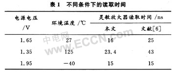 表1是該電流靈敏放大器在不同電源電壓和環(huán)境溫度下的讀取時間。從表1中可以看出在較低電源電壓和惡劣環(huán)境下該電流靈敏放大器仍然有比較好的性能。表1還把本文的電流靈敏放大器的仿真結果與參考文獻[6]所仿真的結果進行了對比,可以看出在本文所設計的電流靈敏放大器在某些情況下有更快的讀取速度。