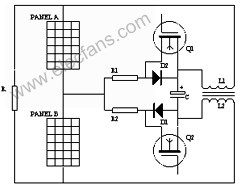 在DC--DC變換器中,用具有單向?qū)щ娦缘木w管和場(chǎng)效應(yīng)管做開(kāi)關(guān),只能實(shí)現(xiàn)功率的單方向流動(dòng),而實(shí)際各太陽(yáng)能電池板開(kāi)路電壓差別正負(fù)是隨機(jī)的。需要一種可以實(shí)現(xiàn)功率雙方向流動(dòng)DC--DC變換器。