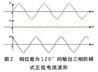 以上分析表明,對于三相永磁同步電機,當三相繞組輸入三相對稱的正弦電流時,由于在內部產生圓形旋轉磁場,電機的輸出轉矩為恒值。因此,將交流伺服控制原理應用到三相混合式步進電機驅動系統(tǒng)中,輸入的220V交流,經整流后變?yōu)橹绷?,再經脈寬調制技術變?yōu)槿冯A梯式正弦波形電流(見圖2),它們按固定時序分別流過三路繞組,其每個階梯對應電機轉動一步。