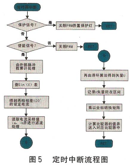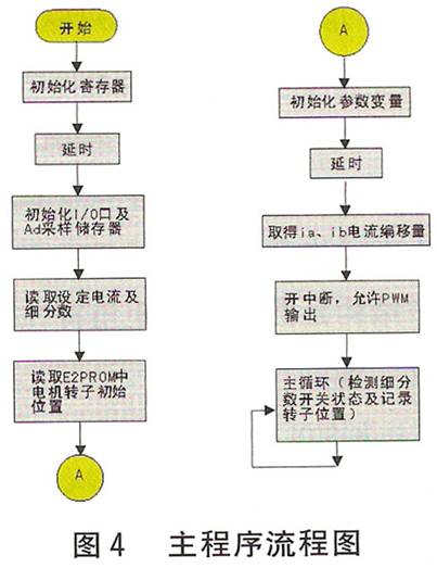 圖4示出主程序流程圖,圖5示出定時中斷流程圖。為減少功耗和保護電機,設置了自動半電流功能(靜態(tài)鎖軸或沒有脈沖輸入時電流減半),它由滯環(huán)比較器自動進行調節(jié)。