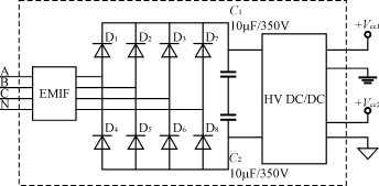 這種供電方式體積和重量較大,成本也較高,顯然按以上電路連接時,對三相四線供電時不能缺零線,對三相三線供電時不能缺公共地線,如B相;另外,有的供電局用戶要求,三相電度表輸入端任意兩線有電壓輸入時都能工作,則圖5的設(shè)計便不能達到目的;當采用三相電度表專用開關(guān)電源模塊供電時,可解決以上問題,其內(nèi)部結(jié)構(gòu)圖如圖6所示。