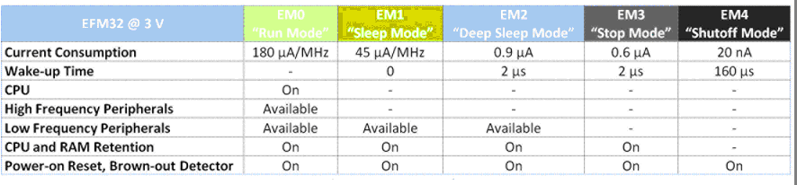 圖3. EFM32 Gecko微控制器的一個關(guān)鍵屬性是它提供給用戶的能源模式選擇,例如,在完整的關(guān)閉模式中電流消耗僅有20nA,而在深度睡眠模式(保持通電復(fù)位、燈光暗淡檢測器、實(shí)時時鐘,并保留RAM內(nèi)容和CPU狀態(tài))下僅有900nA。