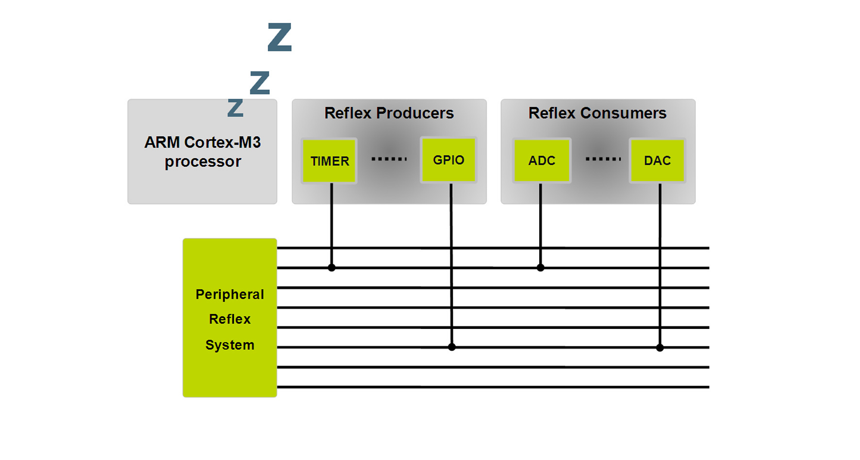圖6.使用Energy Micro的''''''''''''''''外圍設(shè)備反射系統(tǒng)—一個復(fù)雜的互聯(lián)矩陣—就可以執(zhí)行簡單的任務(wù)如開始數(shù)據(jù)轉(zhuǎn)換和存儲結(jié)果,完全無需喚醒32位處理器內(nèi)核。