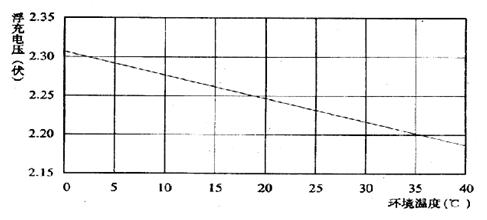 在電源系統(tǒng)中,電池總是在線備用工作的,這樣電池基本處于長期的浮充狀態(tài)中,浮充電壓的選取對電池的長期可靠運行起著至關(guān)重要的作用。正如前面看到的,偏高的浮充電壓會造成電池緩慢失水并產(chǎn)生熱失控而使電池失效;偏低的浮充電壓會造成電池長期處于充不飽電的狀態(tài),使電池發(fā)生硫酸化而導(dǎo)致電池失效。正確的浮充電壓一般應(yīng)選在2.23V-2.25V/單體,并應(yīng)隨同電池工作溫度進行相應(yīng)調(diào)整。由于電池生產(chǎn)廠家的不同,這一參數(shù)會有一些差異,應(yīng)嚴格按照廠家提供的參數(shù)選取。圖1是某廠家電池浮充電壓同溫度的關(guān)系曲線。