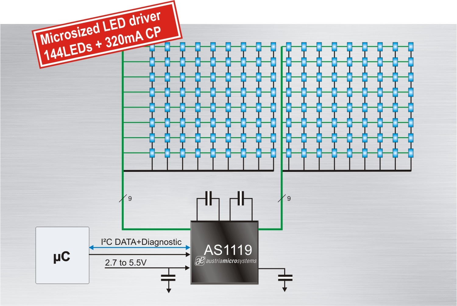 AS1119可驅(qū)動(dòng)144顆LED,憑借其最佳調(diào)光控制和片上電荷泵,不僅可創(chuàng)造出色彩豐富且流暢的動(dòng)畫,同時(shí)延長(zhǎng)了電池壽命。