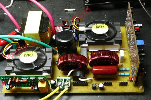 本機(jī)前級(jí)功率管和H橋的功率管都用風(fēng)扇散熱(安裝方法下面再詳述),這是一種小型儀表風(fēng)扇,比電腦上的CPU風(fēng)扇還要小一點(diǎn),實(shí)驗(yàn)證明,在600W輸出的情況下,H橋的4個(gè)功率管散熱不成問題,但前級(jí)的二個(gè)功率管好象散熱不夠一點(diǎn),如果有可能,最好用大一點(diǎn)的風(fēng)扇。