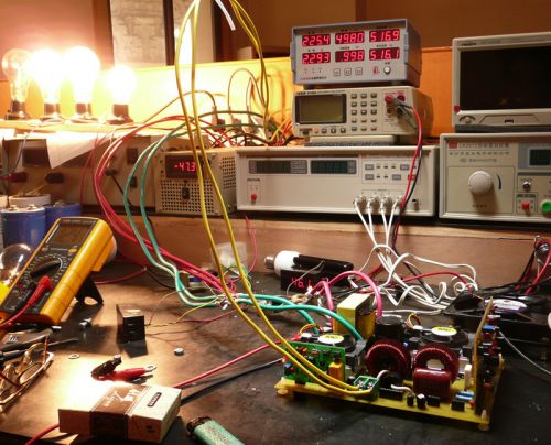 這里,可以稍稍為前級(jí)加點(diǎn)負(fù)載,可以用二個(gè)100W220V的燈泡串聯(lián)起來,接到高壓解的二端,這時(shí)電瓶電流可達(dá)到12A左右,讓它工作一段時(shí)間,看看前級(jí)功率管有沒有溫升,如果溫升不明顯,可以把電瓶保險(xiǎn)絲換大點(diǎn),繼續(xù)加大負(fù)載,一般在功率管散熱正常的情況下,前級(jí)可以加到600W左右。在加載的情況下,再看D極波形,應(yīng)該是正常的方波,稍有點(diǎn)尖峰是沒有關(guān)系的,如果尖峰過大,說明變壓器制作不過關(guān),要重新繞制。