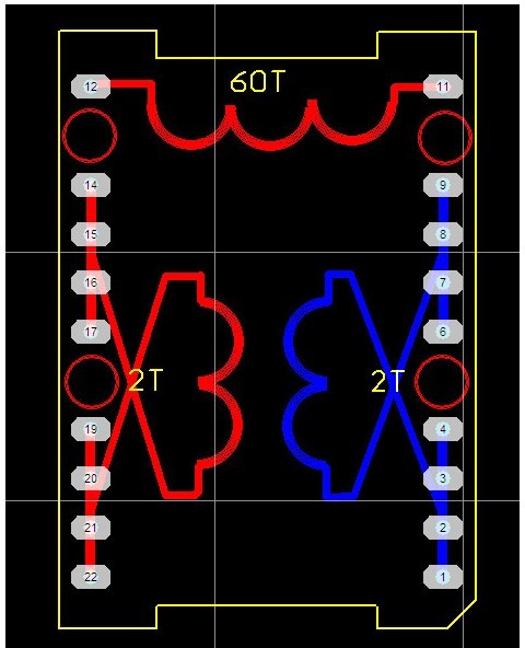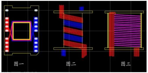 先用5根0.93線繞2圈(見圖二中紅線),中間留空隙,再在空隙處用另外5根線繞2圈(見圖二中藍(lán)線),每根線長(zhǎng)約37CM。用同樣的方法繞二層,層間包二層膠帶,這樣就相當(dāng)于用了10根線并繞。繞完低壓繞組,在繞組外用高溫膠帶包三層。繞低壓繞組要注意的問題是:線頭留在下面,即骨架引腳處,線尾留長(zhǎng)一點(diǎn),暫時(shí)留在骨架的上面(等繞完高壓繞組后要向下折下來)。從(圖一)可以看出,實(shí)際上,低壓繞組的頭和尾是有一段是重疊的,也就是不是2圈,而是約2.2圈,這樣做可以大大減少漏感。
