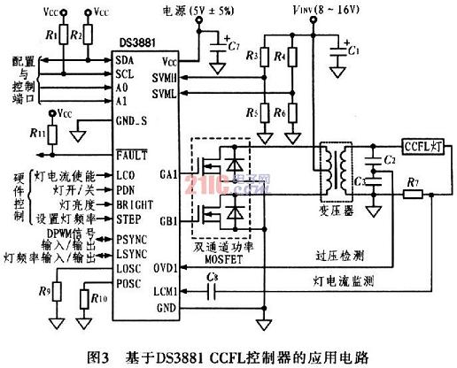 由于基本的CCFL電路中包含有外部晶體管、變壓器和燈管,CCFL架構(gòu)存在EMI輻射源。圖3給出利用DS388lCCFL控制器構(gòu)建的CCFL燈管電源電路,該設(shè)計優(yōu)化于汽車應(yīng)用環(huán)境。DS388l利用擴(kuò)展頻譜和頻率偏移技術(shù)大大降低了EMI輻射,并把噪聲頻譜搬移到系統(tǒng)不敏感的頻段,從而克服了EMI輻射。