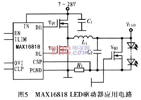 需要較高照明功率的場合,如泛光燈或霧燈,必須使用超高亮度LED(HBLED)。HBLED需要較高的驅(qū)動電流,前面討論的產(chǎn)品無法提供低成本設(shè)計,需要過多的驅(qū)動器產(chǎn)生所需的電流。最好采用能驅(qū)動大電流功率管的控制器,大電流功率管可以為HBLED提供高達(dá)30A的電流,MAXl6818可以滿足這種設(shè)計要求,如圖5所示。