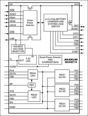 任何便攜電子系統(tǒng)都要求低成本、小尺寸、輕便。而為板上子系統(tǒng)設計電池充電及供電電路時,用電源管理IC可以方便地實現上述功能。這類的器件有很多,比如Maxim公司的MAX8671X,其可以從USB口或外部交流適配器獲取電源,為鋰離子或鋰聚合物電池充電。除了充電功能外,該器件內部還集成了用于USB和直流輸入的過壓保護開關,5路獨立的片上穩(wěn)壓器,這一組合大大減少了電路板的外部元件數量。