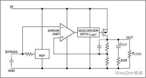 低壓差線性穩(wěn)壓器(LDO)的結(jié)構(gòu)主要包括啟動(dòng)電路、恒流源偏置單元、使能電路、調(diào)整元件、基準(zhǔn)源、誤差放大器、反饋電阻網(wǎng)絡(luò),保護(hù)電路等,基本工作原理是這樣的:系統(tǒng)加電,如果使能腳處于高電平時(shí),電路開始啟動(dòng),恒流源電路給整個(gè)電路提供偏置,基準(zhǔn)源電壓快速建立,輸出隨著輸入不斷上升,當(dāng)輸出即將達(dá)到規(guī)定值時(shí),由反饋網(wǎng)絡(luò)得到的輸出反饋電壓也接近于基準(zhǔn)電壓值,此時(shí)誤差放大器將輸出反饋電壓和基準(zhǔn)電壓之間的誤差小信號(hào)進(jìn)行放大,再經(jīng)調(diào)整管放大到輸出,從而形成負(fù)反饋,保證了輸出電壓穩(wěn)定在規(guī)定值上;同理如果輸入電壓變化或輸出電流變化,這個(gè)閉環(huán)回路將使輸出電壓保持不變,即: