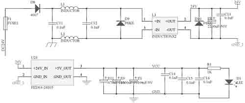 本控制模塊的電源電路如圖2所示。車載蓄電池—發(fā)電機的電源從24V_1處進入,二極管D16主要是防止電源的正負(fù)極被誤接反。電感L1、L2對電源進行濾波,和共模電感L3、電容C8配合,可以過濾掉電源中的尖峰脈沖。二極管D24P6KE51A是脈沖干擾抑制器(TVS),它可以快速吸收超過額定電壓的尖峰脈沖,瞬時通過電流很大,最大功率可達500~1000W。電容E5和C9進一步對電源進行濾波。過濾干凈的電流通過開關(guān)電源芯片LM2576變換為系統(tǒng)使用的5V電源。電容E7和C11對輸出5V電源進行濾波,電阻R18和發(fā)光二極管D28指示當(dāng)前是否有電。