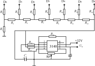 這需要將計數(shù)器的二進制數(shù)轉(zhuǎn)化為電壓。顯然用D/A轉(zhuǎn)換是可以的,但電路復雜程度上升,成本也有所提高。故為了簡化電路我們僅借用D/A轉(zhuǎn)換網(wǎng)絡的思想,利用權(quán)電阻T形網(wǎng)絡將4516的7位數(shù)值變換成模擬量輸出,推動電壓表指示,見圖5。