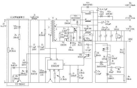圖3 由雙極型開關(guān)管和DPA424P構(gòu)成15WPOE模塊的內(nèi)部電路