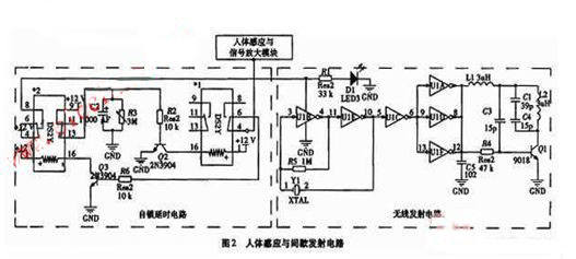 無線發(fā)射電路:電路由左邊延時部分觸發(fā)接通。電路由CD4069六反相器中的A、B、電阻R5、晶振組成高頻振蕩器,C、D、E、F分別組成整形及驅動電路,信號經三極管9018放大,再經L2、C1、C4諧振后向空中發(fā)射。