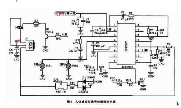 電路主要包括了電源電路、人體熱釋電紅外線傳感器、信號處理芯片、控制及執(zhí)行電路等部分。電源電路通過阻容(R15和C12)降壓,并經過D1、D2整流,將220 V交流電轉換成可供芯片及外圍電路工作的低壓直流電(4.0 V~5.5 V)。CSC9803芯片工作電壓為直流4.O V~5.5 V,內置穩(wěn)壓3.1 V輸出直接驅動PIR管。人體紅外釋熱傳感器PIR探頭感應到信號經CSC9803芯片內部放大,若判斷有觸發(fā),運放輸出高電平,防止誤觸發(fā)??刂菩盘栍?/span> 芯片的11腳輸出,經三極管放大控制雙向可控硅導通,從而控制外部交流接觸器或繼電器電磁線圈持續(xù)接通。