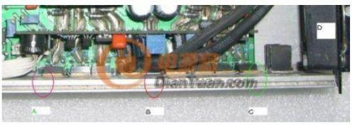 攝氏25度環(huán)境時(shí),輸出滿載1000W,10分鐘后圖片B處(8個(gè)MOS管的中心位置)的溫度比A處高出6~8度!C處(綠圈)最低,比B處低14~15度?。–處為進(jìn)風(fēng)口,D為風(fēng)扇,樣機(jī)為進(jìn)風(fēng)設(shè)計(jì),據(jù)說是用以延長含油軸承的壽命),同樣型號(hào)并聯(lián)工作的功率MOS管,實(shí)際工作的溫差那么大,自然對(duì)“均流”是極其不利!所以可靠性不高就不足為怪了。