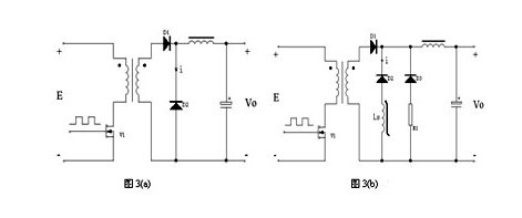 在圖3(a)所示的正激電源電路中,當初級功率管V1開始導通,次級整流二極管D1開始導通,D2開始截止時,由于二極管PN結的電荷存儲效應,D2中流過了電流變化率di/dt很大的反向恢復尖峰電流i,致使V1、D1中也有相應的尖峰電流流過,在漏感、線電感等因素的共同作用下會在電源輸出端產(chǎn)生高頻的導通噪聲。在D2上施加的反向電壓越大,D2的反向恢復時間越長,反向恢復電流變化率di/dt就越大,電源輸出噪聲也就越大。大的反向恢復尖峰電流,不僅會產(chǎn)生電源噪聲,也容易損壞整流器件。