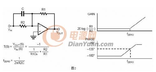 零點是頻域范圍內的傳輸函數當分子等于零時產生的。在博得圖中,零點發(fā)生在增益以20dB每十倍頻的斜率開始遞增的點,并伴隨有90度的相位超前。圖2描述一個由高通濾波器電路引起的零點。