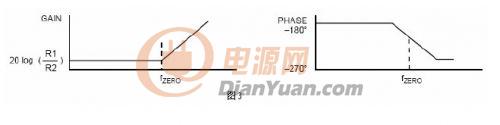存在第二種零點,即右半平面零點,它引起相位滯后而非超前。伴隨著增益遞增,右半平面零點引起90度的相位滯后。右半平面零點經常出現于BOOST和BUCK-BOOST轉換器中,所以,在設計反饋補償電路的時候要非常警惕,以使系統的穿越頻率大大低于右半平面零點的頻率。右半平面零點的博得圖見圖3。