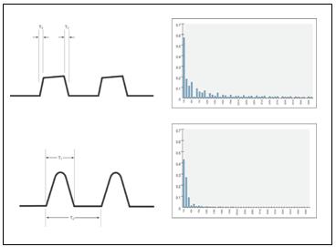 圖3–PWM(上圖)和零電流開關(guān)(下圖)的電流波形和頻譜。注:波形并不按比例繪制。