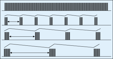 突變模式技術(shù)又稱打嗝模式(hiccupmode)或周期省略模式(圖3)。在負(fù)載很大情況下,回掃電路根據(jù)輸出電壓變化來調(diào)制脈沖寬度。當(dāng)負(fù)載降低到一定程度時,控制電路將維持原有脈沖寬度,轉(zhuǎn)而周期性跳過部分脈沖,控制電路通過降低總脈沖寬度或增加遮蔽周期長度達(dá)到降低損耗的目的。該技術(shù)有兩個明顯的缺點,即低頻干擾會和遮蔽周期一起出現(xiàn),而且負(fù)載突然改變也會造成輸出電壓突降。