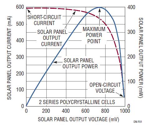 雖然太陽能電池或太陽能電池板是按照功率輸出來分類,但電池板的可用功率卻很少是恒定的。其輸出功率在很大程度上取決于光照、溫度以及從電池板吸收的負載電流。為說明這一點,圖 1 示出了一塊雙電池太陽能板在恒定光照條件下的 V-I 特性曲線。I-V 曲線在短路 (最左側(cè)) 至大約 550mA 負載電流的范圍內(nèi)具有相對恒定的電流特性,隨之在較低的電流條件下它遵從于恒定電壓特性,并在開路時 (最右側(cè)) 趨近于最大電壓。電池板的功率輸出曲線顯示:功率輸出在大約 750mV/530mA 的地方 (I-V 曲線的拐點處) 出現(xiàn)一個明顯的峰值。如果負載電流增至超過功率峰值,則功率曲線迅速下降至零 (最左側(cè))。同樣,輕負載也會使功率趨向于零 (最右側(cè)),不過這往往不太會是一個問題。