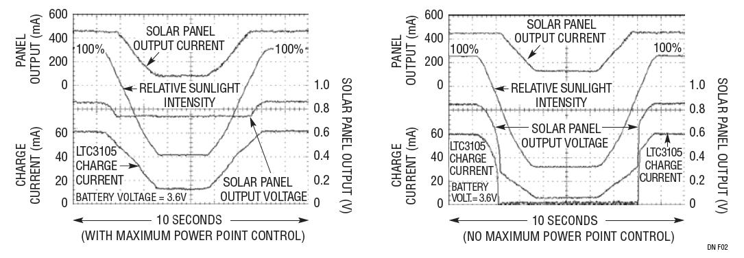 圖 2 示出了在采用和未采用最大功率點控制的情況下,陽光的變化對于充電電流的影響。模擬陽光的強度從 100% 降至約 20%,而后回升至 100%。請注意,當陽光強度下降至 20% 左右時,太陽能板的輸出電壓和電流也下降,但是 LTC®3105 的最大功率點控制則可以防止太陽能板的輸出電壓降至 750mV 的設(shè)定值以下。它通過減小 LTC3105 的輸出充電電流以防止太陽能板電壓驟降至接近 0V 來實現(xiàn)上述功能,如圖 2 中右側(cè)的曲線圖所示。而在未采用功率點控制時,陽光強度的小幅下降也會完全阻斷充電電流的流動。