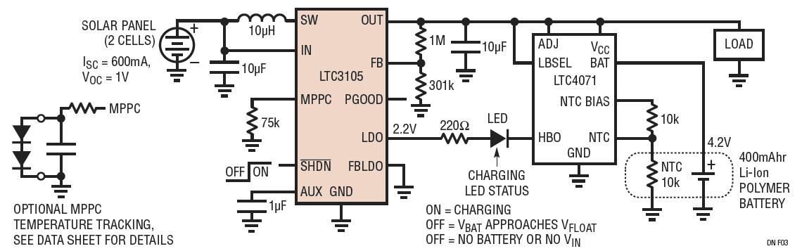 雖然本文描述的電路僅可產(chǎn)生幾百 mW 的功率,但它卻能夠在大多數(shù)天氣條件下提供足以使一個 400mAhr 鋰離子電池保持滿充電狀態(tài)的功率。低輸入電壓與輸入功率控制相結(jié)合,使得 LTC3105 成為低功率太陽能應(yīng)用的理想選擇。此外,LTC4071 并聯(lián)充電系統(tǒng)還通過提供精準浮置電壓、充電狀態(tài)和溫度安全特性而對 LTC3105 給予了補充,可在室外環(huán)境中確保長久的電池使用壽命。