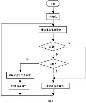 在此硬件電路的基礎上,結合單片機的控制系統(tǒng)可檢測輸出電壓低于某一設定值時,單片機便認為負載電弧是處于短路狀態(tài),這時單片機便對IGBT的最小脈沖寬度進行限制,以保證吸收電容有足夠的放電時間,從而降低IGBT的關斷反向電壓。同時為保證輸出電流恒定,單片機在判斷輸出為短路時將逆變器的等脈沖寬度調節(jié)(PWM)變?yōu)轭l率調節(jié)控制(PFM),即脈沖分頻控制,輸出電壓越低,輸出脈沖的頻率越低。其單片機程序過程如圖5所示: