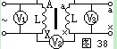 把初級線圈和次級線圈的一對同名端,例如Aa,用導線接起來,如圖38所示。然后在AX初級線圈間拉入交流電(比較低的便于測量的)。用電壓表分別測 量AX間電壓V1值,XX間電壓V2值,以及ax間電壓V3值。如果V2數(shù)值是V1與V3電壓之差,則Aa是同極性端,如果V2數(shù)值是V1與V3電壓之和,則AX是同極性端。