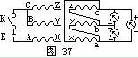測單相變壓器時,如圖36所示,在初級線圈一側(cè)拉入一個1.5伏的干電池,然后在次級線圈拉入一直流毫伏表。當合上開關K的一瞬間,表針朝正方向擺動(或拉開開關時表針向負方向擺),說明接電池正極一端是同極性,或叫同名端。測試三相變壓器的極性和級別,多采用直流法進行。測試方法為:在初級線圈側(cè)接上干電池和開關K,先在A端接電池正極,B端接電池負極,再在次級線圈a、b、c之間拉入三個毫伏表,如圖37所示,