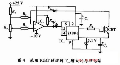 當(dāng)電源輸出過載或者短路時,IGBT的Vce值則變大,根據(jù)此原理可以對電路采取保護措施。對此通常使用專用的驅(qū)動器EXB841,其內(nèi)部電路能夠很好地完成降柵以及軟關(guān)斷,并具有內(nèi)部延遲功能,可以消除干擾產(chǎn)生的誤動作。其工作原理如圖4所示,含有IGBT過流信息的Vce不直接發(fā)送到EXB841的集電極電壓監(jiān)視腳6,而是經(jīng)快速恢復(fù)二極管VD1,通過比較器IC1輸出接到EXB841的腳6,從而消除正向壓降隨電流不同而異的情況,采用閾值比較器,提高電流檢測的準(zhǔn)確性。假如發(fā)生了過流,驅(qū)動器:EXB841的低速切斷電路會緩慢關(guān)斷IGBT,從而避免集電極電流尖峰脈沖損壞IGBT器件。