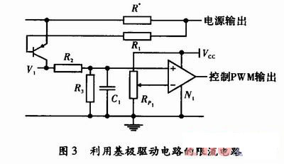 在一般情況下,利用基極驅(qū)動電路將電源的控制電路和開關(guān)晶體管隔離開??刂齐娐放c輸出電路共地,限流電路可以直接與輸出電路連接,工作原理如圖3所示,當(dāng)輸出過載或者短路時,V1導(dǎo)通,R3兩端電壓增大,并與比較器反相端的基準(zhǔn)電壓比較??刂芇WM信號通斷。