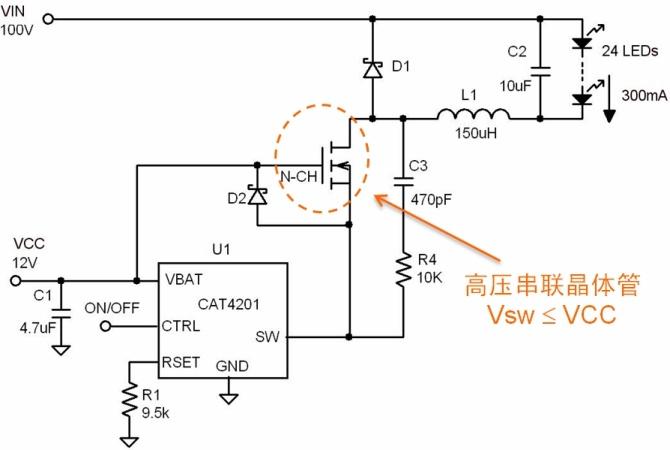 在這種模塊化途徑下,一項設計能夠擴展用于多種光輸出等級。而且隨著LED光輸出性能增強,LED模塊要提供相同光輸出等級,所需采用的燈條就更好。而每個燈條都設有一個專用的DC-DC LED驅動器,如可以采用安森美半導體的CAT4201高能效降壓LED驅動器。CAT4201專門優(yōu)化用于驅動大電流LED,采用具有專利的開關控制算法,提供高能效及精確的LED穩(wěn)流(可達350 mA)。CAT4201可采用最高36 V的電源電壓供電,并兼容于12 V和24 V標準照明系統(tǒng)。圖3顯示的是CAT4201的高壓LED驅動器配置,外圍的N溝道MOSFET支持高壓輸入:100 V輸入電壓時LED功率達30 W;50 V輸入時LED功率達13 W。