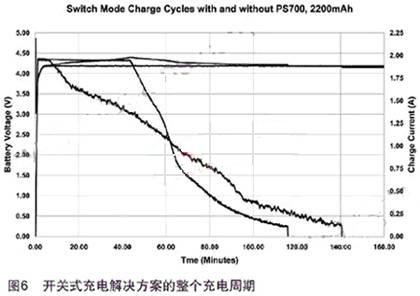 利用開關(guān)式充電解決方案的整個(gè)充電周期如圖6所示。通過(guò)在充電系統(tǒng)中采用電池監(jiān)控器,可以大大縮短充電周期,使用電池監(jiān)控器就不必再檢測(cè)電池包保護(hù)電路兩端的電壓以及充電電流的接觸電阻。